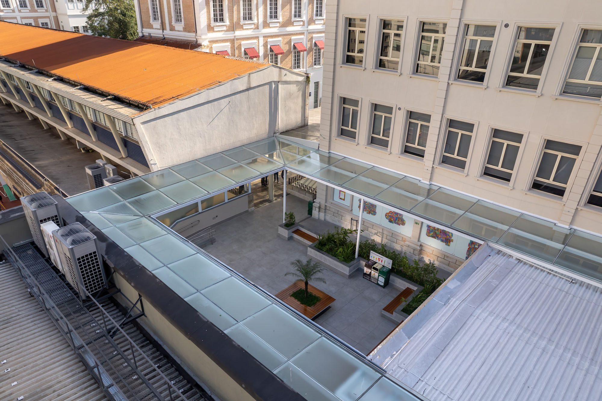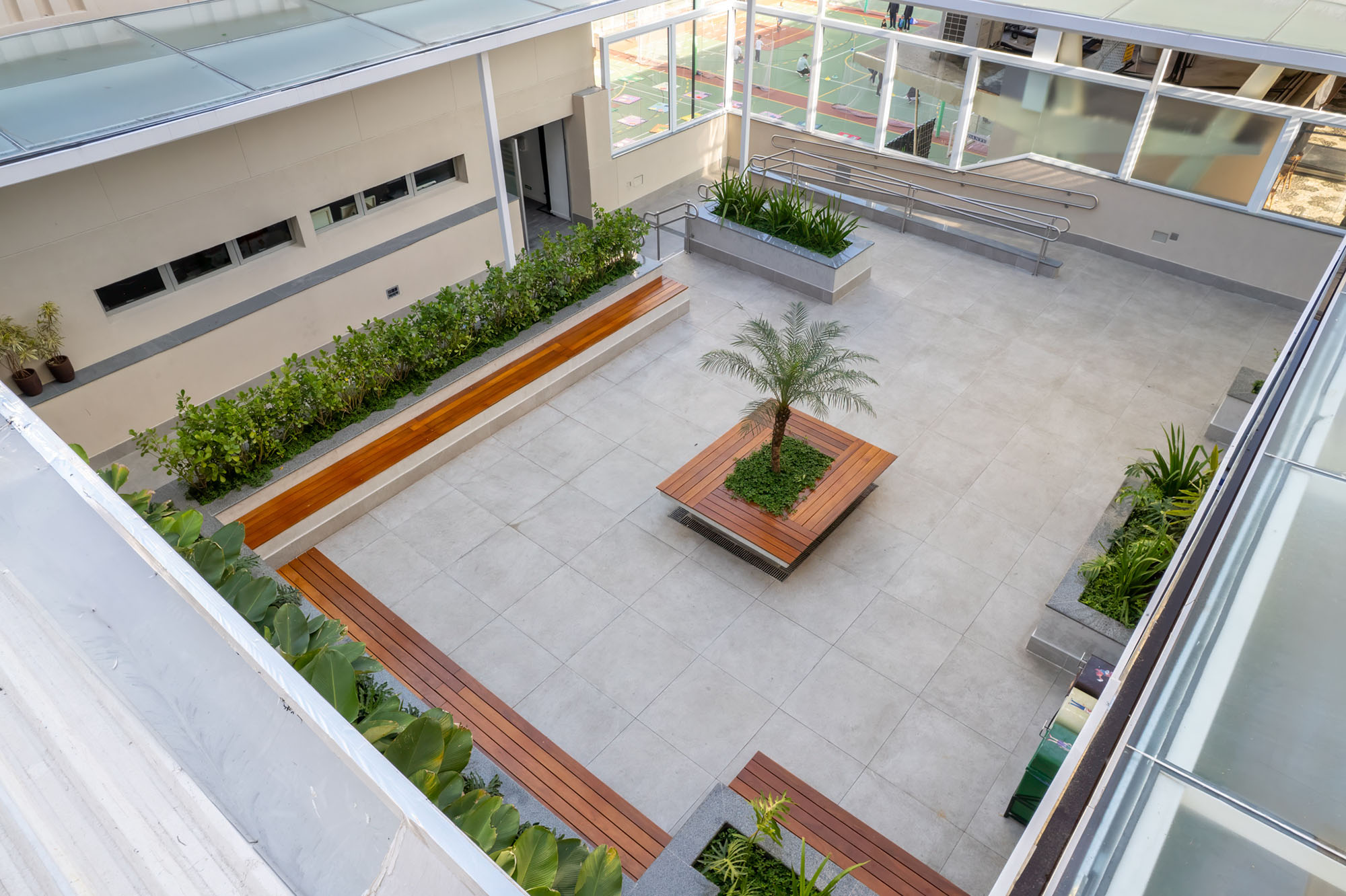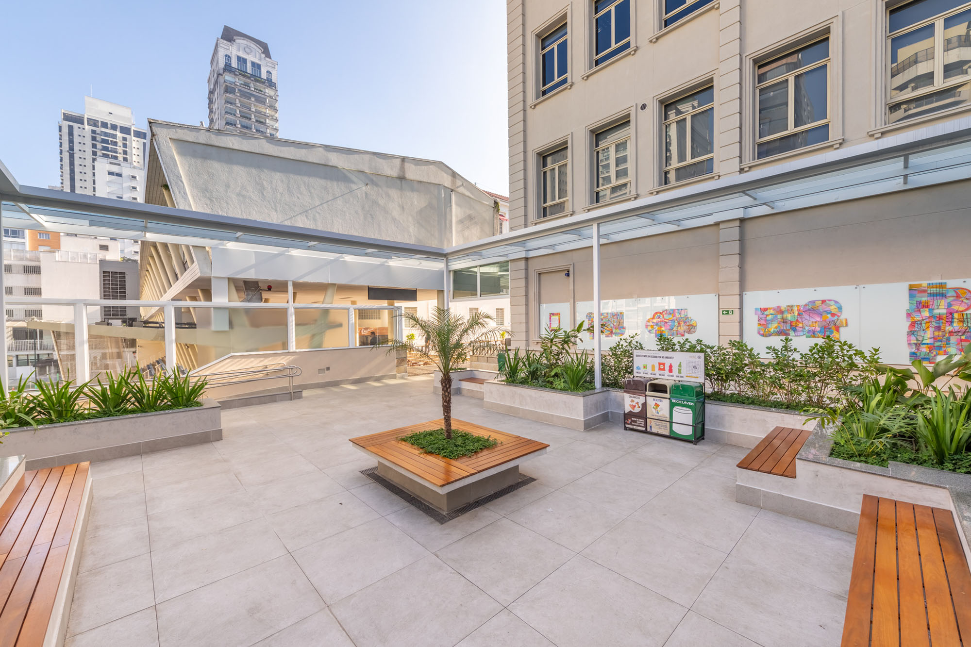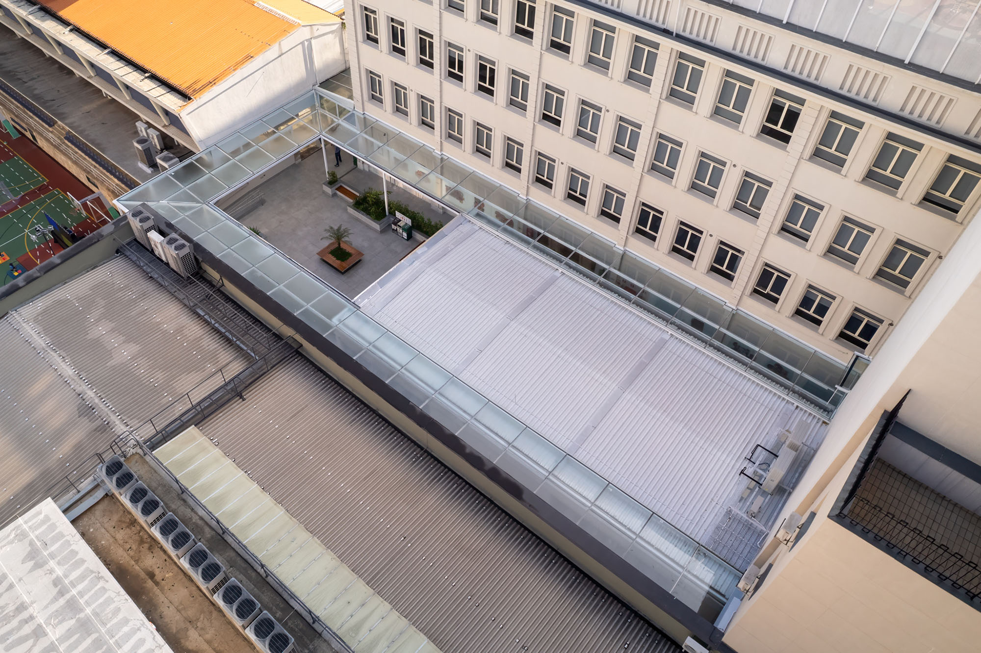 Foi construída uma nova laje, em steel deck, com edifício com novas salas de aulas e pátio aberto com área de lazer.