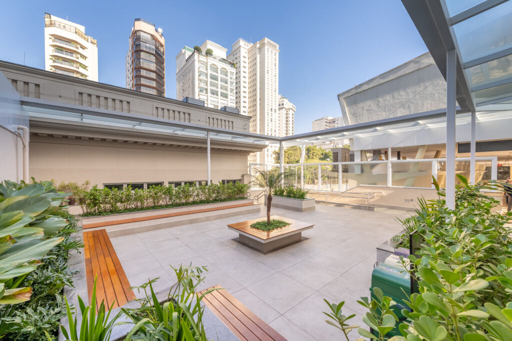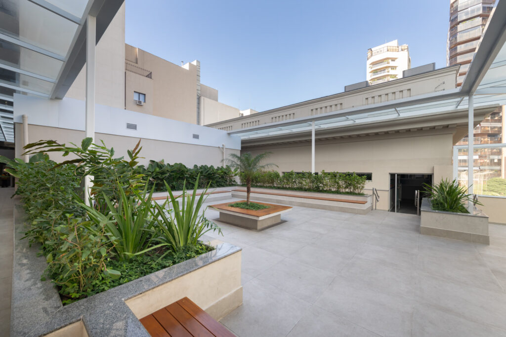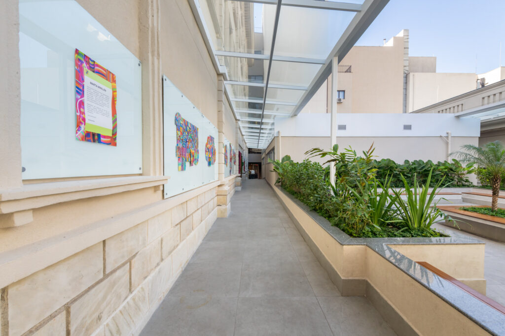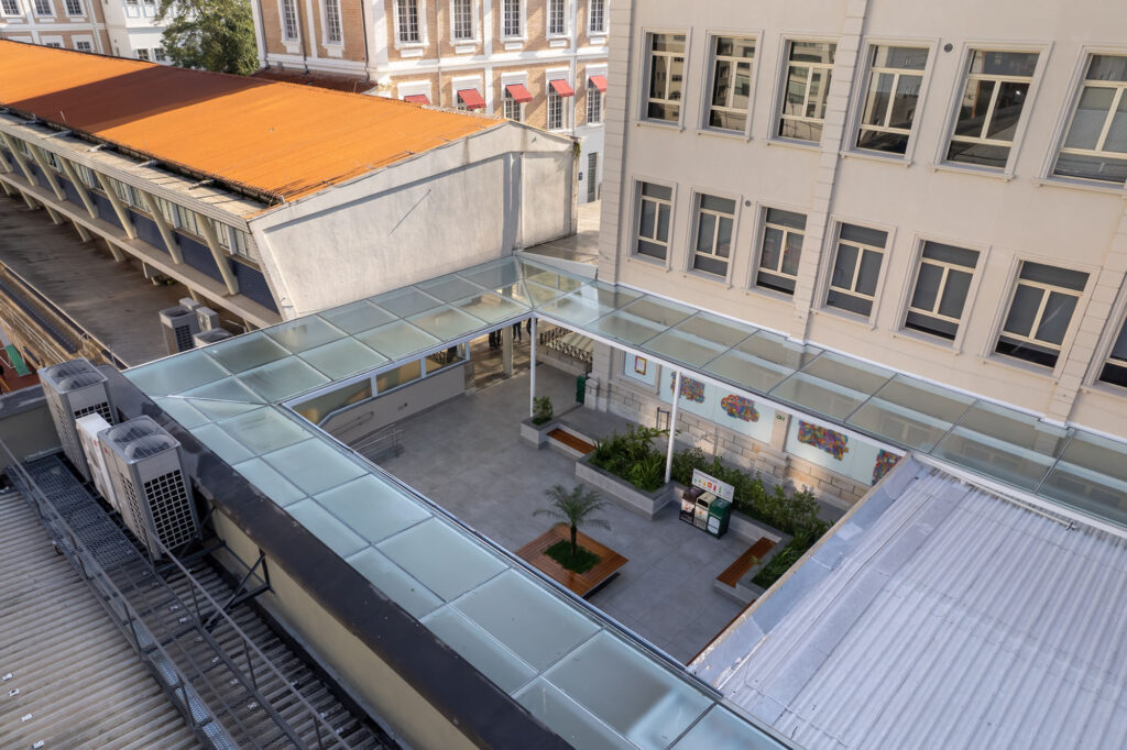 Obra de implantação de novo pátio entre edifícios tombados, no Colégio Dante Alighieri.